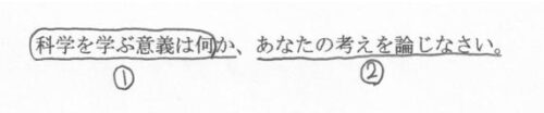 例えば「科学を学ぶ意義とは何か、あなたの考えを述べなさい」のように、テーマと解答の条件が設問文で提示されます。